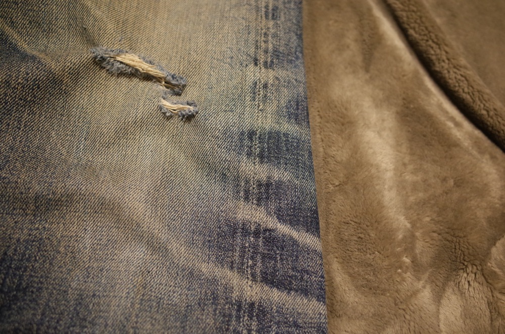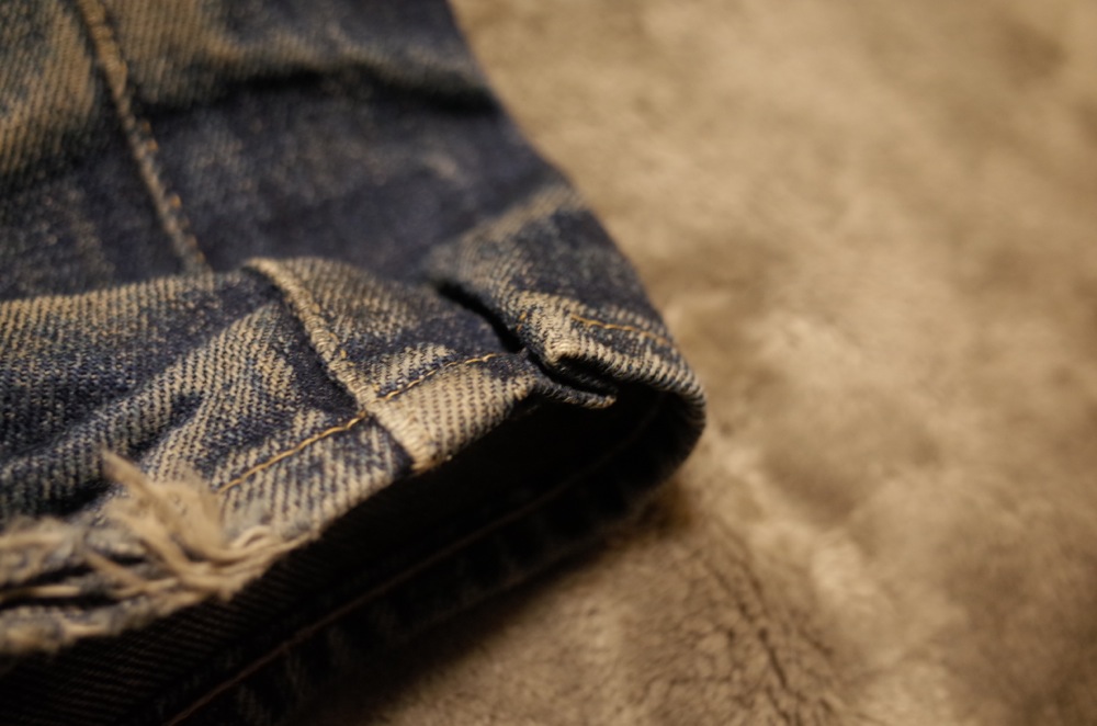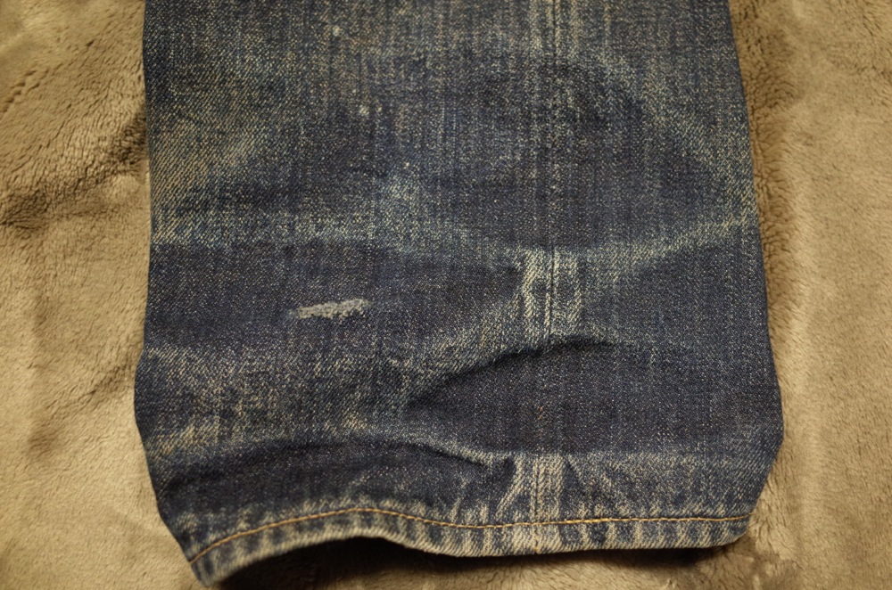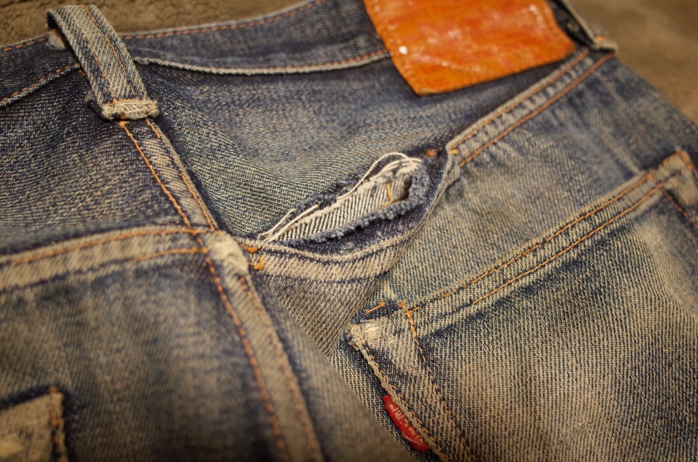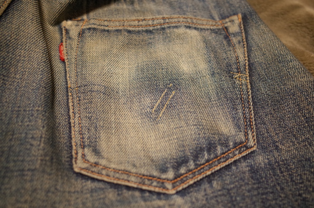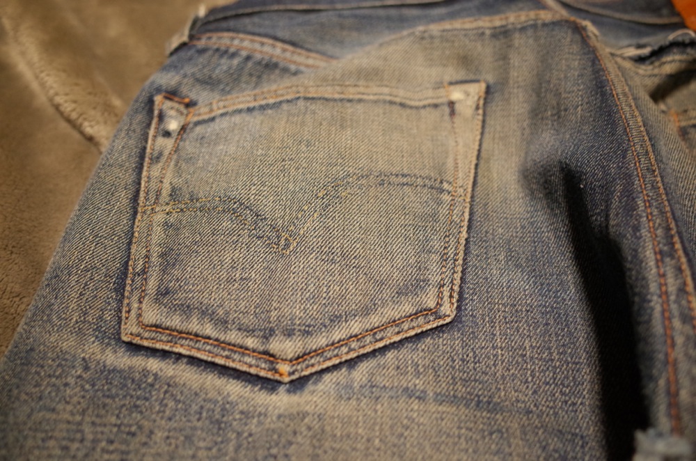 バックポケットのアーキュエイトステッチも切れちゃってますが、もともとステッチがあったところのインディゴの残りがいい感じです。