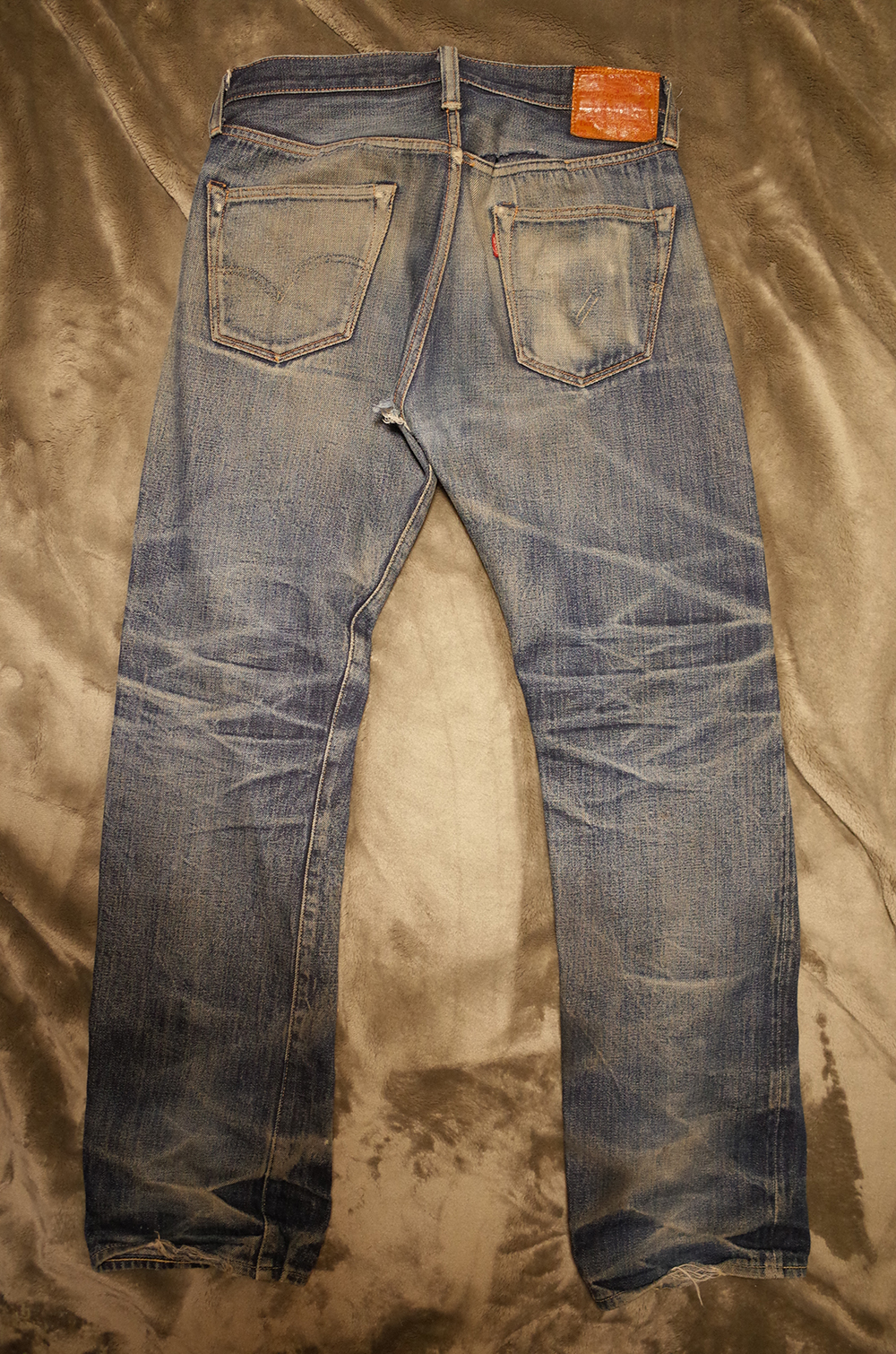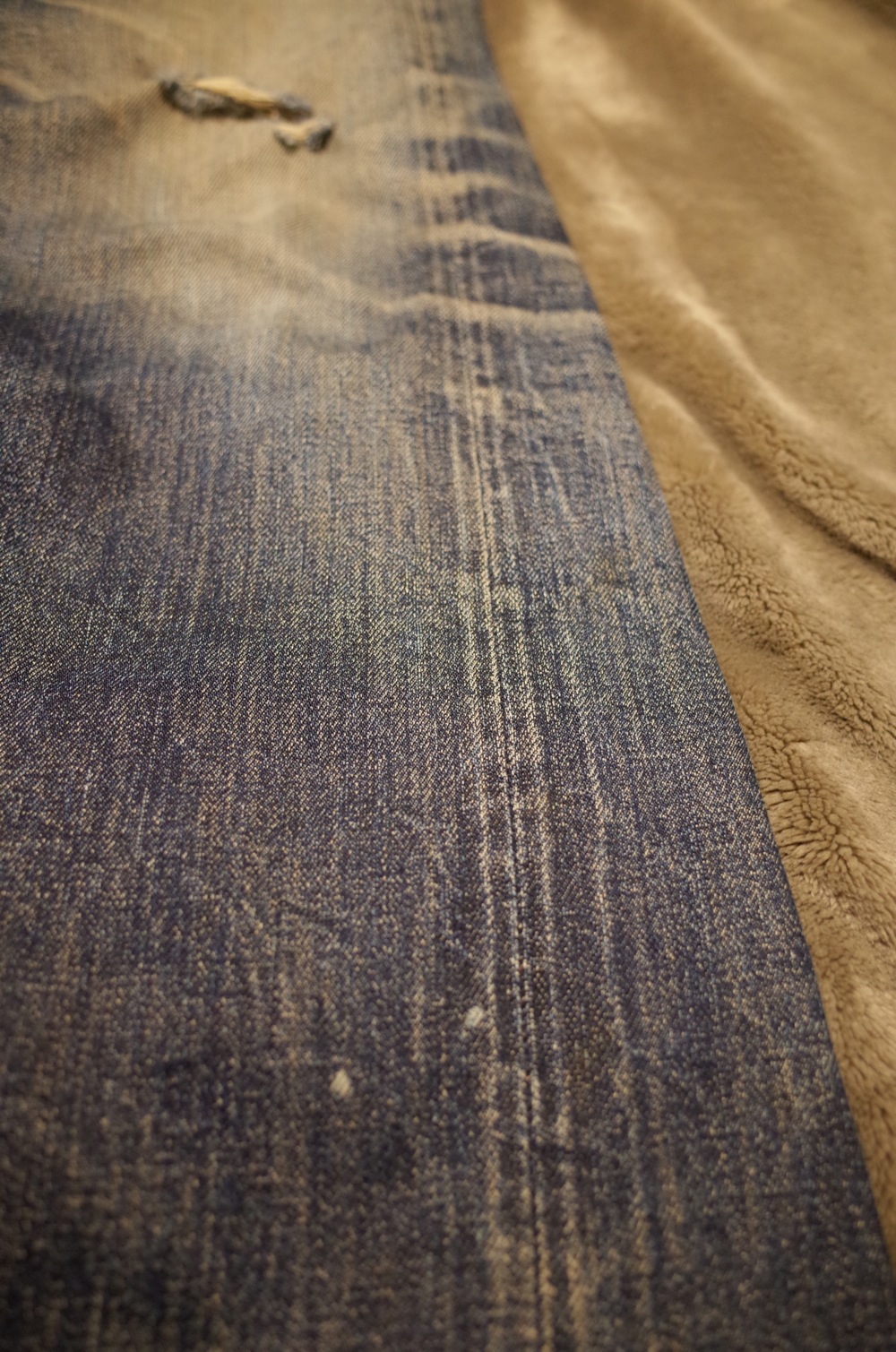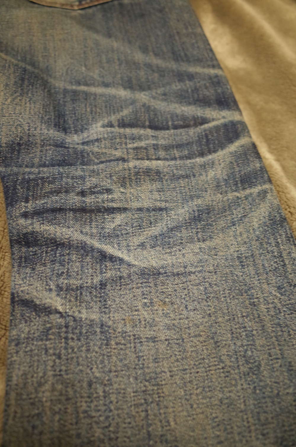 バックポケットのアーキュエイトステッチも切れちゃってますが、もともとステッチがあったところのインディゴの残りがいい感じです。
