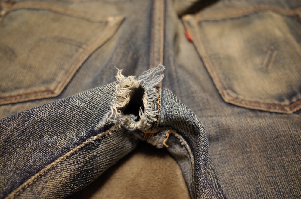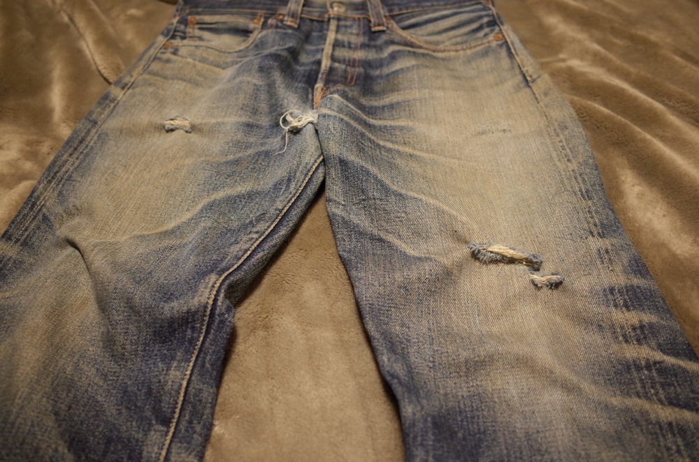 で、このジーパンは腿、股、膝、お尻、至る所にダメージがあって、見た目はカッコいいんですが、履くたびに崩壊していくので引退させてようと思い、最後に記録としてこのブログに載せておきます。